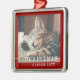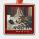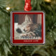 Personlig Photo Ornament med en bild av katten eller kattungen med "Meowy jul" och deras namn i en modern rödröd och silver-ornament med ett unikt elegant- och skrivskrivarteckensnittskombination.