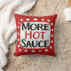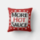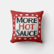 "Mer Hett Sauce" är en söt textdesign i rött med svart och röd text, tillsammans med en vit accentform och vita texturerade vita prickar runt den.