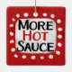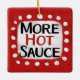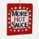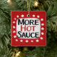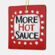 "Mer Hett Sauce" är en söt textdesign i rött med svart och röd text, tillsammans med en vit accentform och vita texturerade vita prickar runt den.