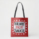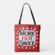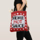 "Mer Hett Sauce" är en söt textdesign i rött med svart och röd text, tillsammans med en vit accentform och vita texturerade vita prickar runt den.