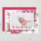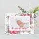 En elegant poinsettia, holly och gräs arrangemanga ramar på er bild av baby inför detta tillkännagivande om julfödelse. Det finns ett andra foto på meddelandet med födelsestatus och personlig. Det här fotot och den här texten är ramade med ett botaniskt mönster.