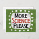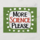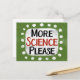"Mer vetenskap, tack" är en söt textdesign i grönt med svart och röd text, tillsammans med en vit accentform och vita texturerade vita punkter runt den.