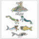 Den här illustrationen visar en mängd merfolk från värld runt. De förtjänster som skildras är: en blondinskött nordeuropeisk sjöjungfru, en rödhårig hankrad av irländskt lore, ett blåflått danskt havand, en halsklädd bonit från traditionerna hos Sada-folket på Salomonöarna, en mänskligt belagd japansk ningyo och en rödögd kaaiman på syd-Afrikan.