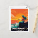 Send an enchanting and whimsical fantasy postcard with this design! Inspired by bold vintage travel posters, this illustration features a beautiful mermaid with vibrant teal hair and a shimmering tail, perched on a rock at sunset.
