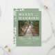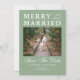 This minimalist merry and almost married save the date doubles as a holiday card from an engaged couple. The design features classic typography against a green background with snowflakes. Photo template via Pixabay licensed under CC0 and must be replaced with your own photo