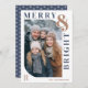 Send warm holiday wishes with this stylish modern Christmas photo card featuring the cheerful phrase “Merry & Bright” in bold navy and bronze typography. The clean layout highlights your favorite family photo framed with elegant white space for a polished, contemporary look. Personalized text below allows you to include your family name and year, while the back features a festive navy snowflake pattern for an added touch of winter charm. A perfect way to share your joy and brighten the season with loved ones.
