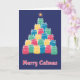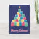 Ett färgstarkt julkort med katter formade som en julgran. Blå bakgrund. Texten i botten av kortet står "Merry Catmas". Tom insida för din personliga hälsning. Storlek 5" x 7".