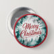 A Christmas button with "Merry Christmas" written in scarlet script with a silver and turquoise background.
