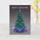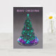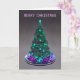 Merry Christmas text can be customized by you. Decorated tree with gifts underneath.