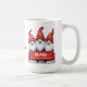 "This charming and rustic Christmas design features a detailed illustration of the back of a vintage red pickup truck. Peeking out over the tailgate are three festive gnomes, each wearing a large, textured red knitted hat and boasting a fluffy white beard. The hand-painted, slightly rustic style gives the design a cozy farmhouse aesthetic. This graphic is highly versatile for farmhouse Christmas decor, holiday garden flags, kitchen towels, seasonal apparel, or greeting cards."