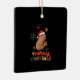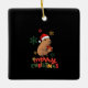 This festive illustration features an adorable capybara, wearing a Santa hat and holding a small gift, with colorful snowflakes surrounding it. At the bottom, a cheerful "MERRY CHRISTMAS" greeting is displayed in decorative lettering, creating a lovable holiday-themed design against a contrasting black background.