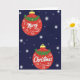This card beautifully captures the calm essence of the holiday season with two red Christmas ornaments set against a deep navy blue background. The ornaments stand out with their rich red color and are arranged to spell "Merry Christmas" in elegant white writing. Each ornament is decorated with green foliage and hints of golden berries, adding a traditional touch. Intricate white swirls and dots adorn the red spheres, adding a festive touch to the design. The blue backdrop is filled with white starbursts and shimmering particles, creating a celestial scene reminiscent of a snowy night or twinkling stars. The combination of bold reds and greens with the glittering blue background creates a visually inviting and harmonious image. This card radiates a sense of peace and magic, perfect for spreading holiday cheer 🎅🏼🎄🎁. Share the joy of the season with this enchanting visual greeting.