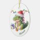 På framsidan av detta knapphändiga keramiska prydnadsföremål för ett barn är en vacker dinosauer från baby som bär en julhatt. Han har en Julgran-lampa mellan fötterna och en gåva paket bredvid honom. Det finns en sträng av Helgdag ljus bakom honom. Ditt barns namn är mörk grönt i nedre högerna. Baksidan av dekorationen har ett God jul-meddelande och din namnteckning. Perfekt till en dotter, son, barndotter eller barnson som kärlek dinosaurier.