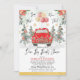 Festive drive by inbjudningskort för möhippan med pulserande rödballonger och guld-ballonger, vattenfärgen gräs träd, snöskogens landskap och en chic vintage bil