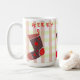 White mug with pastel plaid background and patchwork-style christmas stockings — features the word "merry" in bold red letters, perfect for cozy holiday mornings and festive gifting.