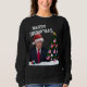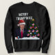 Merry TRUMP'MAS jul Sweatshirt American Flagga Ornament Julgran Golden Star och Eagle. Trump med en jultomt och God jul i vitt, Snö i bakgrunden.