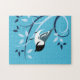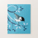 Dekorativ fågelkonst på pussel med mes sittande på en stiliserad gren i ett virvelmönster.