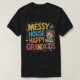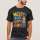 Den här designen har en svart t-shirt med ord "MESSY HOUSE" staplad ovanpå "LYCKLIG BARNBARN". Brev ligger i en färglös tecknad stil. Utformningen omfattar även en tecknad teckning av ett leende barn som har ett leksak-flygplan.