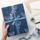 Här har vi en papper som innehåller en metallisk filigree-menorah och ord Peace, Kärlek, Light inuti ett dekorativt ram mot en mörk blått bakgrund. Detta papper finns i många-storlekar och är en matchning mot andra inslagna , vävnadspapper, presentpåsar och ett gratulationskort. Det här är en perfekt till dina gåvor den här julhelgen.