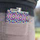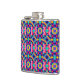 Metallic flask with vibrant geometric pattern in blue, pink, yellow, and purple. Bold design with overlapping shapes on the front and left view.