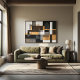Geometrisk abstrakt konst som kombinerar rektanglar och subtila former i svart, vitt, grått och metalliskt guld. Den strukturerade kompositionen frammanar modern arkitektur med industriella texturer. Perfekt för samtida inredning som söker sofistikation, visuell balans och en touch av diskret lyx.