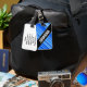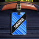 Denna bagagemärkredesign presenterar ett mönster av randar eller fodrar kulört olikt skuggar av blått. Den presenterar också ett skräddarsy namn på en vinkel på bekläda, och personligkontakten specificerar på baksidaen.