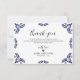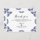 This Mexican Talavera Black Floral Minimalist Wedding Thank You Card design features a minimalist approach with delicate, symmetrical black floral motifs placed in each corner and along the edges. The small, leaf-like shapes create a sense of movement while maintaining an airy, open space in the center, allowing for ample text placement. The simplicity and elegance of the pattern evoke traditional Talavera tiles, giving the design a classic Mexican artisanal feel.