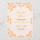 This Mexican Talavera Yellow Floral Minimalist Wedding Invitation design features a minimalist approach with delicate, symmetrical orange yellow motifs placed in each corner and along the edges. The small, leaf-like shapes create a sense of movement while maintaining an airy, open space in the center, allowing for ample text placement. The simplicity and elegance of the pattern evoke traditional Talavera tiles, giving the design a classic Mexican artisanal feel.