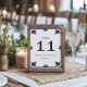 Den mexikanska blå Blommigten Otomi Simple Fiesta Bröllop Bordsnummer har en enkel utformning och en elegant gräns, där mörk blått blommigt och fågel inslag placeras delikat i varje hörn. Centrumområdet lämnas tomt och ramas av en tunn blå linje som ger en ren och minimalistisk bakgrund för texten. Kombinationen av fåglar och blommor, tillsammans med den fastspända användan färg, ge, är ett sofistikerat men traditionellt utseende, inspirerat av mexikanska folkmotiv.