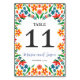 Den här utformningen av Bordsnumret Bröllop i den mexikanska Blommigten Colorful Botanical Flowers har en levande blommigt gräns som består av fet orange, rött, gult och blåa blommor som är sammanflätad med livliga gröntar och löv. Den symmetriska layouten ramar är ett centralt tomt utrymme, perfekt för text, och ge den övergripande sammansättningen är ett strukturerat, festligt utseende. Den platta, rena illustrationen stil och det ljusa, mättade färg framkallar en glad, konstinspirerad estetik som är lämplig för att fira tillfälle som bröllop.