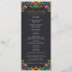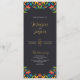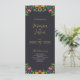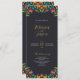 Den här Bröllopsprogrammet med den mexikanska Blommigten Colorful Botanical Flowers visar en symmetrisk blommigt gräns mot en djup kolsvart bakgrund, skapar en fetstil och elegant kontrast. Den översta och grund kant har vibrerande gult, rött, orange och blåa blommor med lush grönt löv, som accentueras av små röda bär för extra synligt intresse. Det breda, tomma centralutrymmet ger en ren perfekt för att lägga till text- eller händelseinformation samtidigt som den ornerade blommigten ram behålls som ett slående dekorativt inslag.