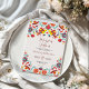 Den här mexikanska Festa Sombrero-folkbröllopsinbjudningen har en gräddbakgrund som gör att de livliga, flerfärgade illustrationerna framträder med slående kontrast. Ljusa gulter, ett helig-hjärta med flammande glöd, sombreros och en mängd stiliserade blommor och löv bildar ett dynamiskt, symmetriskt gräns med mexikanskt inflytande på folkkonst. Mittområdet lämnas tomt, vilket skapar en dramatisk perfekt för text i ram, medan de omgivande motiven framkallar teman om kärlek, firande och kulturell rikedom.