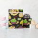 Färgfyllda mexikanska livsmedelsförpackningar, pappra, med en mängd traditionella rätter från Mexiko, inklusive tacos, burritos, enchiladas, kylbönor, empanadas, fajitas, tamales m.m.