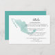 Kortet har en vattenfärg karta i Mexiko med ett litet hjärta över Los Cabos. Ord "informationen finns i ett kursivt stil-teckensnitt. All logikinformation är svart och innehåller en ställe för att lägga till webbplatsinformation för bröllop. Kortets baksida har en akvatisk grönt med briden och brudgummens namn och bröllop-datum i vitt. Denna utformning koordinerar med de andra produkterna i samlingen Mexiko Karta Bröllop.