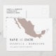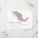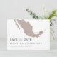 Denna gör-det-själv-UTSKRIFTLIGA bröllops-spara-datum-mall har en rosa Mexiko-karta och en kantig handskriven stil. Använd den här mallen för att redigera teckensnitt, teckensnittsfärg och bakgrundsfärg för att matcha ditt evenemangs behov. Flytta hjärtat och destinationen runt för att markera din bröllopsplats.