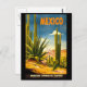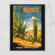 Stor bild från en gammal resemärke för Mexiko med en kaktus i förgrunden och hacienda hus och blommor i bakgrunden.