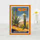 Vacker vintage reseaffisch för Mexiko som visar öknen och kaktusar och en liten stad i bakgrunden.