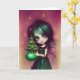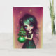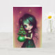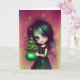 Mia, Illustration Jul konstverk gratulationskort från Ricaso - en illustration av en liten flicka med grönt hår och en grön klänning som håller i ett litet julgran.
