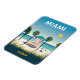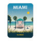Retro Miami Floridas reseaffisch visar hur man ser på en livvakt station på en handflatan-träd-beklädd, solnys och sandy Miami Beach. Den här vintagen kommer att återge minnen av klassiskt resor affischer från en gammal epok.