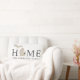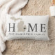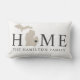 En personlig Michigan ländryggskudde på en vit bakgrund med beige statssilhuett och grå 'Home'-text och anpassningsbart familjenamn. Ett litet hjärta markerar din hemstad på den rena, neutrala designen, med koordinerade ränder på baksidan. Hjärtat kan flyttas för att markera din Michigan-stad. En lätt, luftig present för Michigan-familjer.