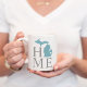 Snyggt anpassningsbar kaffe mugg har en typografisk design med "Home" och Michigan State karta. Klicka på alternativet Anpassa om du vill flytta den vita hjärtpunktsmarkören på båda sidor om mugg. Du kan placera den direkt över staden där du bor eller din hemstad. Grått, damm/skifferblått och vitt färg.