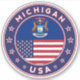 Michigandesign med flagga Michigan och flagga i Förenade Stater, rundad form. Michigan-klistermärke, Michigan-bagagedekal, Michigan-reseregister,