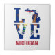 Michiganstaten kärlek. Michigan i ljusröda versaler sans font. ord kärlek fylls med statlig flagga och brev O i kärlek formas i silhuetten.