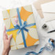 Wrap your gifts in retro style with this wrapping paper featuring mid century modern atomic retro starbursts in orange and mustard yellow