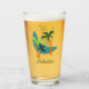 Ett Mid Century stil-grafikobjekt av enkelt handflatan i träd i orange och grönt placerade runt en boomerang-formad oas eller simmade bassäng i anakablått på vardera sidan av detta personlig glas. Sandbakgrunden färg kan redigeras.