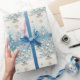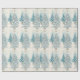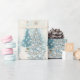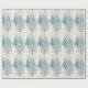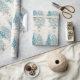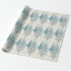 Vacker retro presentpapper med blå och silver julgranar. Det finns en gyllene stjärna högst upp och granarna är upplysta med vita lampor och stjärnor.