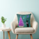 This decorative pillow has a mid century room in teal colour with a pink and silver Christmas tree on a white star rug and a pretty black cat with the text Merry Christmas in colourful festive letters with yellow stars.