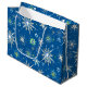 The design displays a festive and busy repeating pattern. It features a rich, solid blue background covered with numerous snowflakes of various sizes and designs. The most prominent snowflakes are large and ornate, colored in shades of white and light gray with star-like points, some of which are slightly tinged with subtle hints of green and blue. Interspersed among the larger designs are smaller, simpler snowflakes and tiny, stylized white and red flower shapes, adding to the overall dense and celebratory feel of the winter holiday motif.