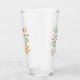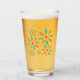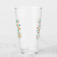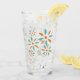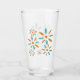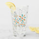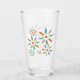 This funky mid-century themed glass tumbler features abstract flowers in turquoise blue and two shades of orange and would be perfect for a mcm bar cart or kitchen table.
