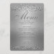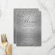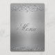 Denna moderna och sofistikerade elegant silver shimmer-menyn för prydnadsmiddagar kan anpassas. Du kan ändra typsnittet och färgerna för större delen av texten och ändra färg i bakgrunden till olika skuggor. Designad av Amelia Carrie och säljs endast via GlitterInvitations.com Obs! Detta är en grafisk återgivning eller grafik och innehåller inget rörigt glitter. #silverMeny #elegantMeny #weddingmeny